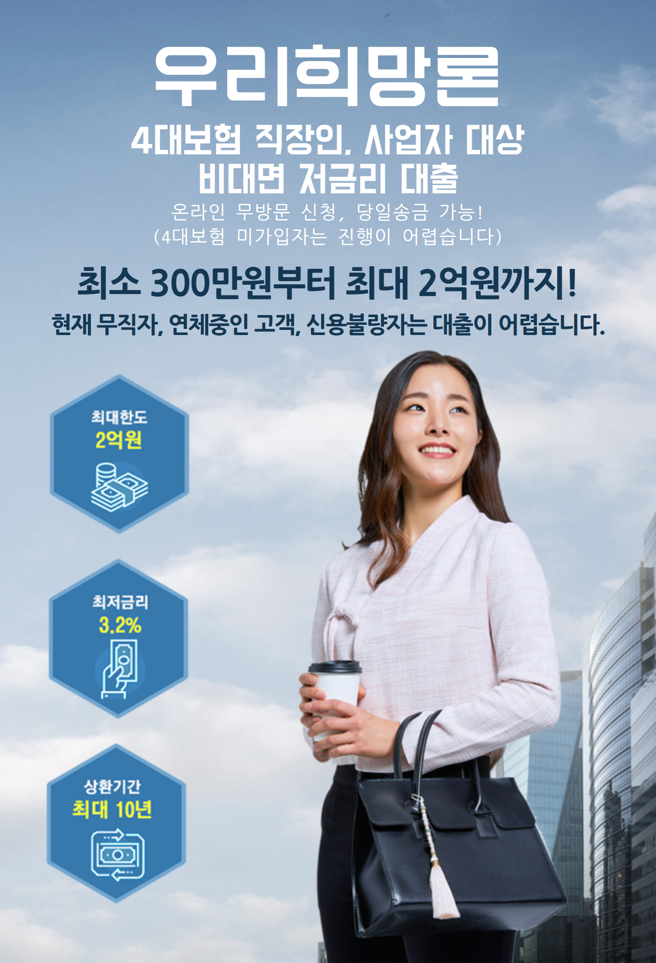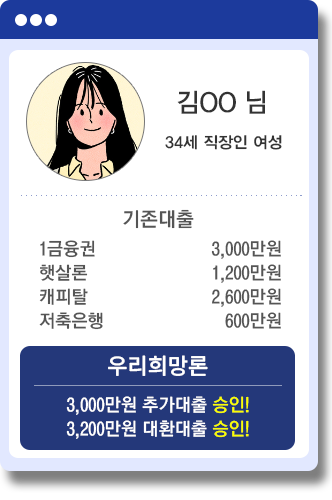 만 20세이상 고객 대상으로 개인신용평점 등 신용도 및 당사 평가기준에 따라 대출 가능 여부 및 이자율 산출. 단 채무불이행 등록자는 제외 |이자는 매월 약정일에 부과하고, 상품에 따라 원금자유상환(만기일시상환), 원리금균등분할상환 등의 방법으로 상환|연체금리 : 약정이자율+3%P이내, 연20%이내.